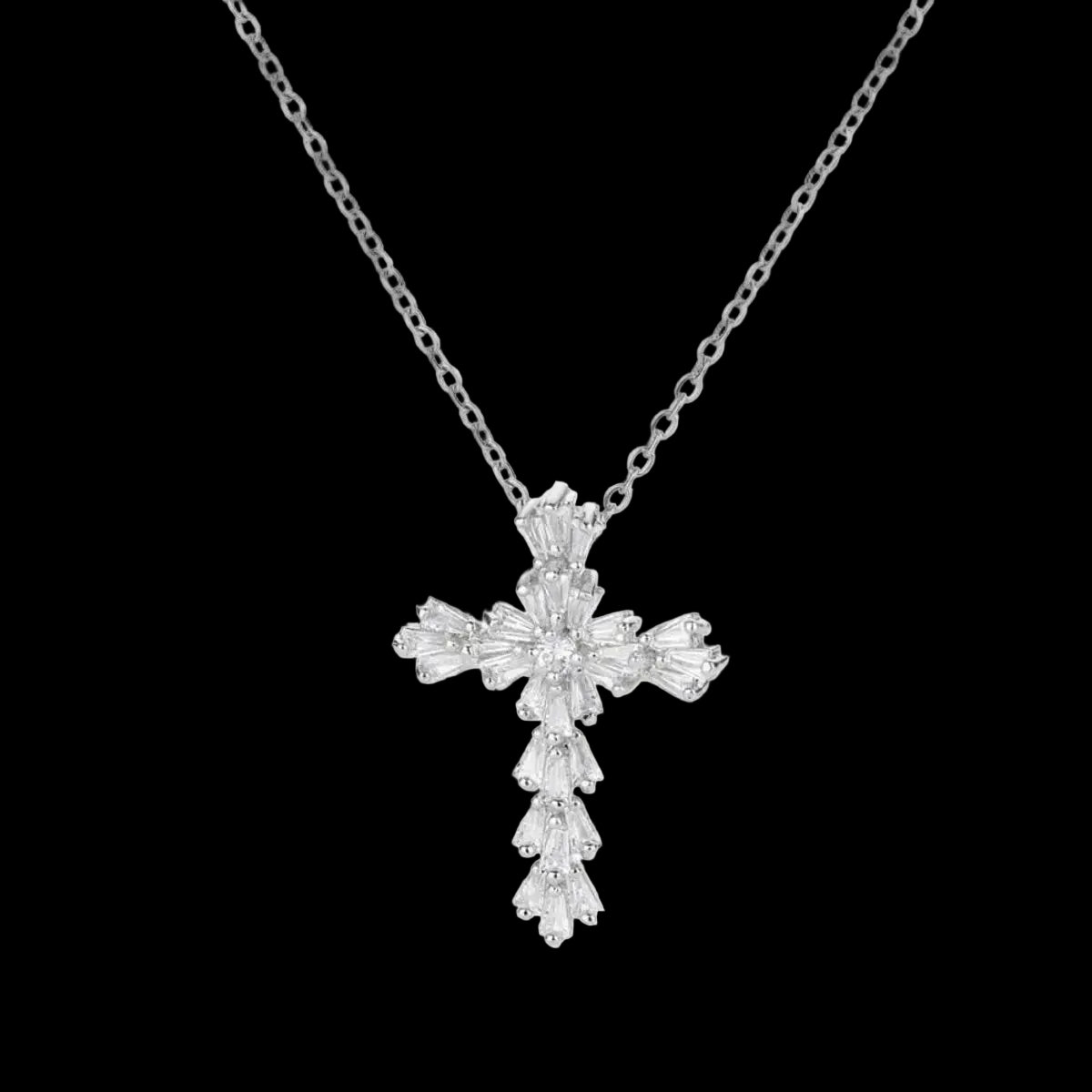 Cross pendant featuring brilliant cubic zirconia stones arranged in an angelic silhouette. The stones showcase exceptional clarity and sparkle, complemented by your choice of authentic silver or gold plating. A refined piece that captures light with understated luxury.