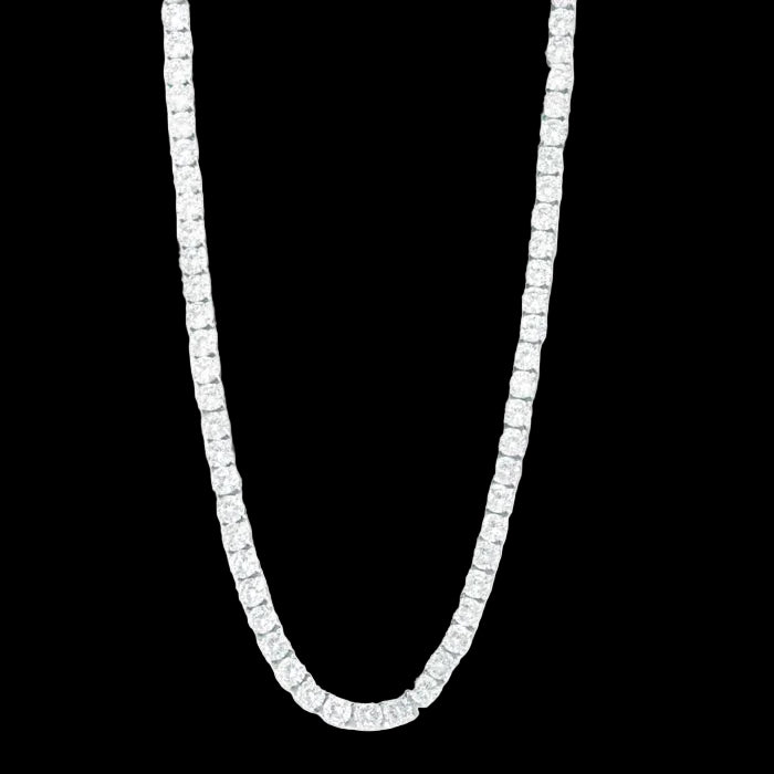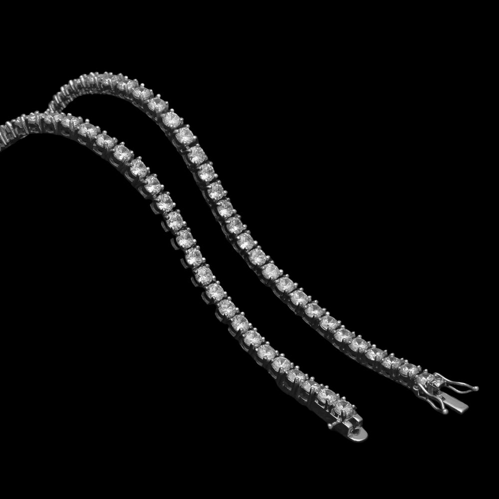 Versatile tennis chain, crafted with premium 5A cubic zirconia stones that sparkle with diamond-like brilliance. Choose between luxe 18K gold plating or classic 925 silver plating to match your style. Available in 3–5mm widths and designed for all, this piece transitions seamlessly from day to night. Also offered as a matching bracelet for coordinated elegance.