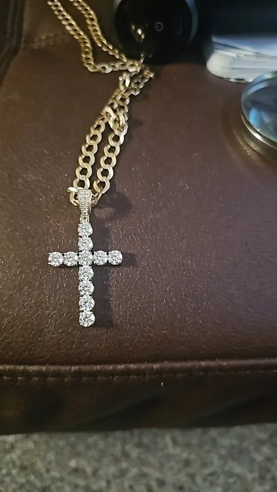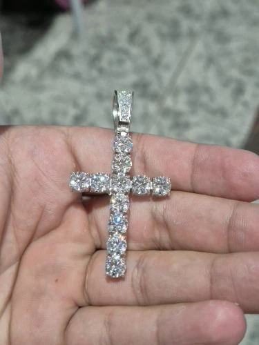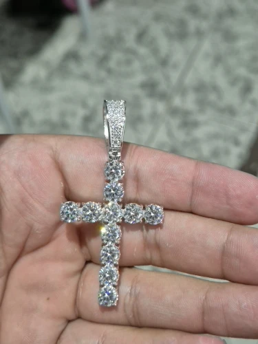 Striking cross pendant featuring premium VVS moissanite stones set in rhodium and gold-plated sterling silver. The dual-finish design balances cool white tones with warm metallic accents, creating a modern yet timeless aesthetic. Durable, hypoallergenic, and designed for everyday wear with lasting brilliance.